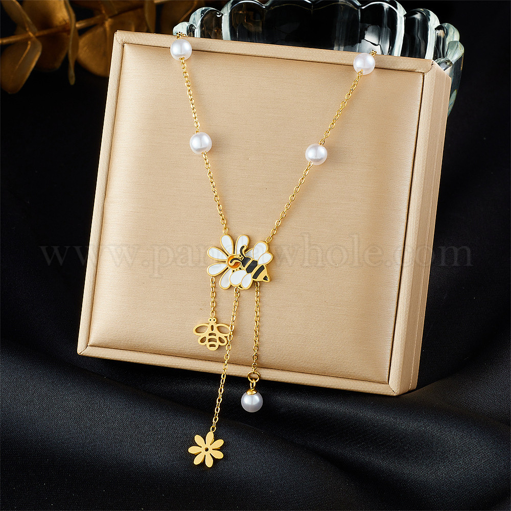 304 Женские ожерелья с подвеской в виде пчелы, цветов и кисточек из нержавеющей стали, белого и желтого цвета с пластиковой жемчужиной