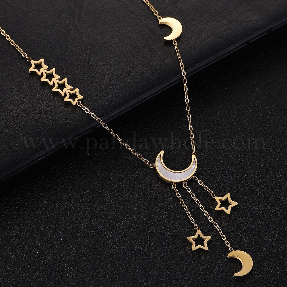 • Золотой 304 ожерелья с подвеской в виде луны и звезды из нержавеющей стали и натуральных ракушек с кисточками, белые, золотые, 16.34 дюйм (41.5 см)