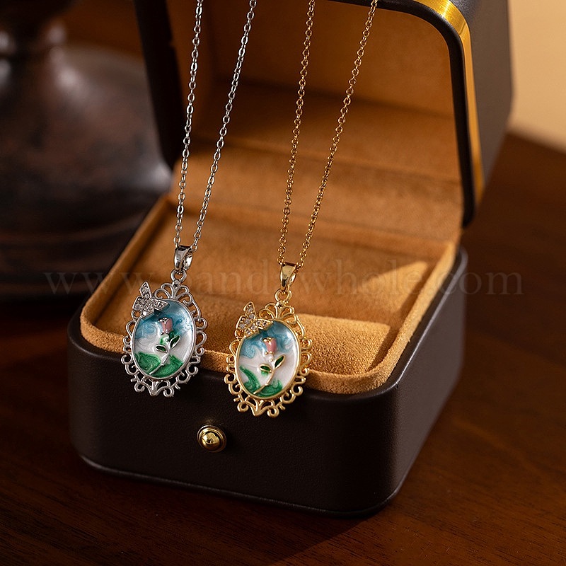 201 Женское ожерелье с подвеской в виде овала из нержавеющей стали с эмалью и стразами в форме бабочки