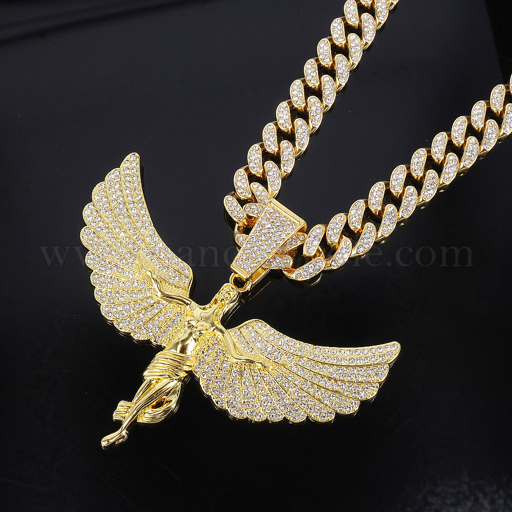 Цепочка-колье из кубинского звена из цинкового сплава с подвеской в виде богини с крыльями ангела, полностью украшенная стразами, для женщин