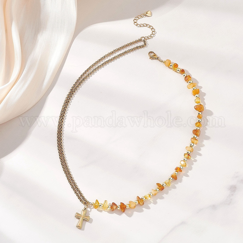 • Золотой 304 из нержавеющей стали крест кулон ожерелья, Женские ожерелья из металлической цепочки роло и бусин из натурального янтаря., золотые, 17.05 дюйм (43.3 см)