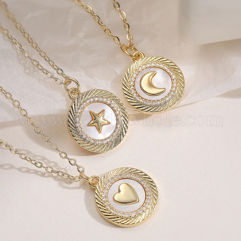 Подвеска-колье из латуни с микропаве из прозрачных кубических цирконий и натуральными ракушками, плоская круглая, для женщин., золотые