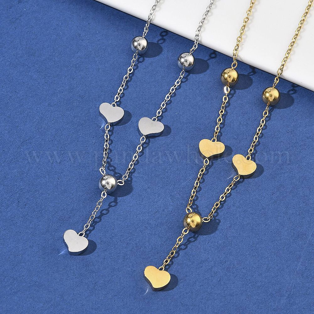 • Золотой Ионное напыление (IP) 304 подвески в форме сердца из нержавеющей стали с 201 круглыми бусинами из нержавеющей стали, золотые, 20.94 дюйм (53.2 см)