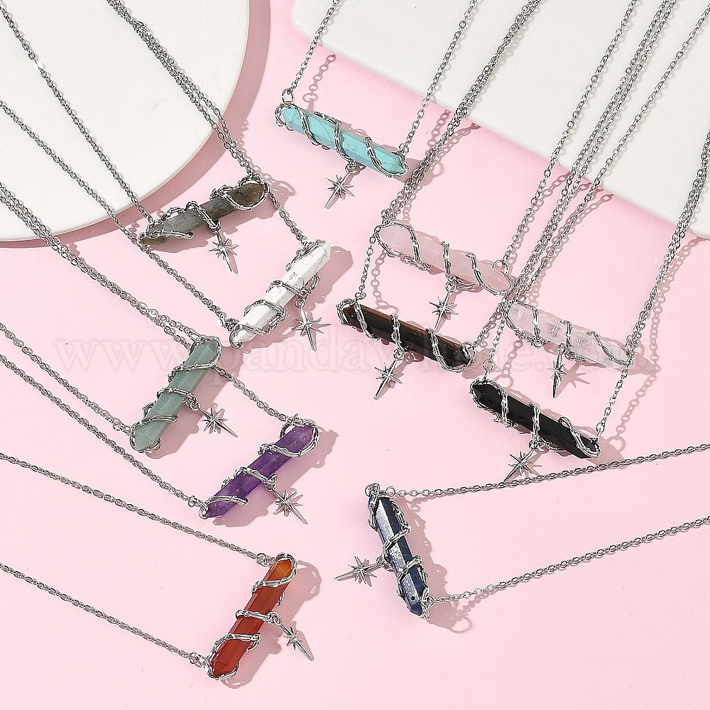 • Смешанные камни Натуральные и синтетические смешанные камни, ограненные заостренные пулевидные цепочки из латуни с подвеской в виде звезды, оплетённой проволокой., стойки покрытие, платина, смешанные окрашенные и неокрашенные, 26.10 дюйм (66.3 см)