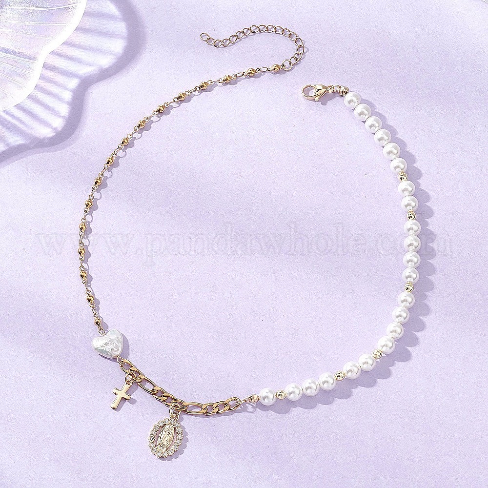 Подвеска в виде креста Девы Марии из прозрачного кубического циркония с микропаве из латуни, Ожерелья из круглых белых жемчужин и натурального жемчуга кеши, изготовленные методом термообработки, с цепочками из нержавеющей стали.