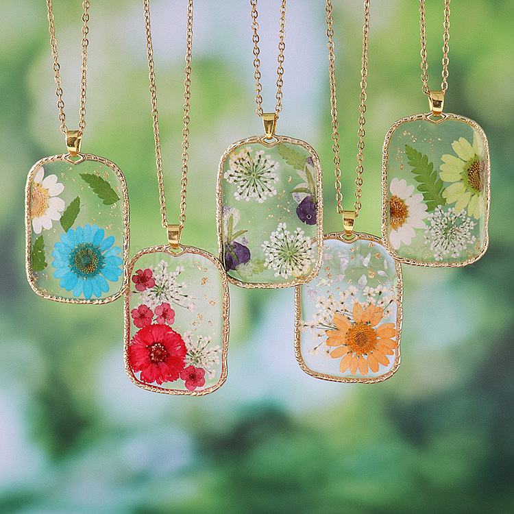 Женские ожерелья из сплава, Подвески-ожерелья из смолы и сушеных прессованных цветов, прямоугольные, золотые