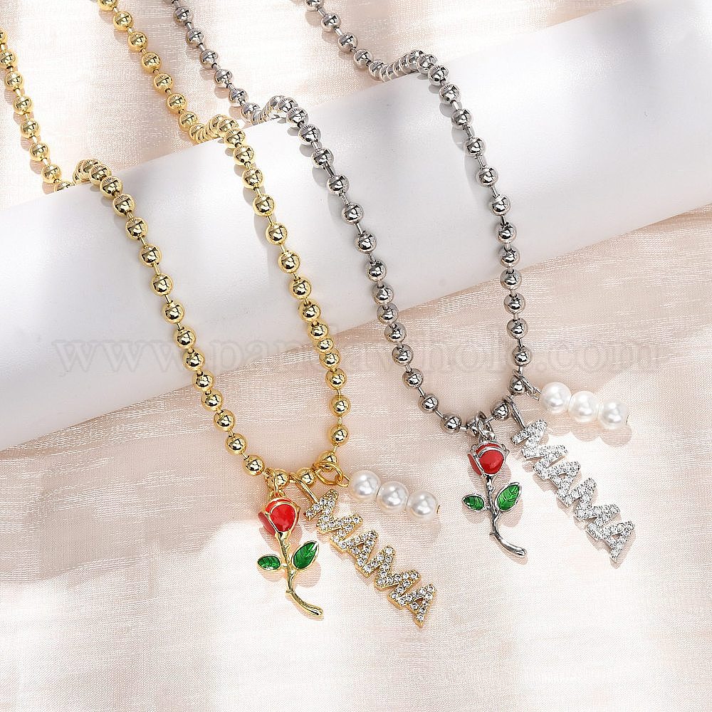 Подвеска-колье ко Дню матери из латуни с микропаве из прозрачного кубического циркония и эмалью в виде красной розы., с искусственными жемчужными бусинами, без кадмия и без свинца, долговечный, стойки покрытие (03BEY3)