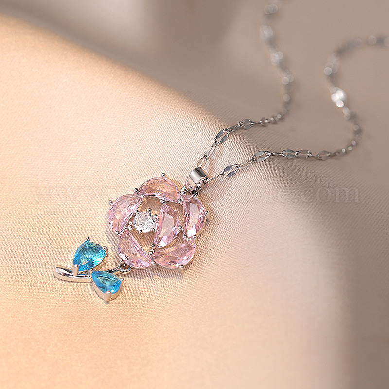 304 Подвеска из нержавеющей стали в виде цветка розы глубокого небесно-голубого и розового цвета с фианитами, цепочка с рифленой поверхностью для женщин