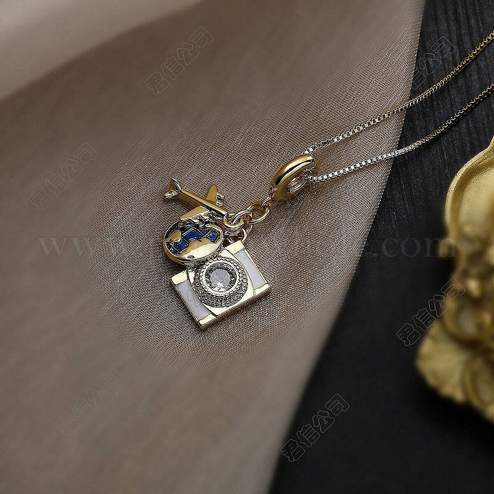 • Золотой Подвеска-кулон из латуни с кристаллами, стразами и эмалью в виде земли, самолета, фотоаппарата для женщин., синие, золотые, 15.75 дюйм (40 см)