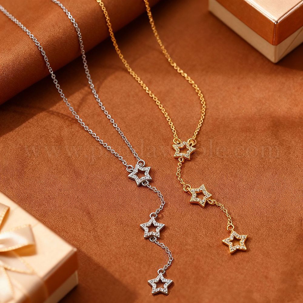 • Платина Подвеска-колье из латуни с микропаве из прозрачного кубического циркония в виде тройной звезды для женщин., платина, 15.75 дюйм (40 см)