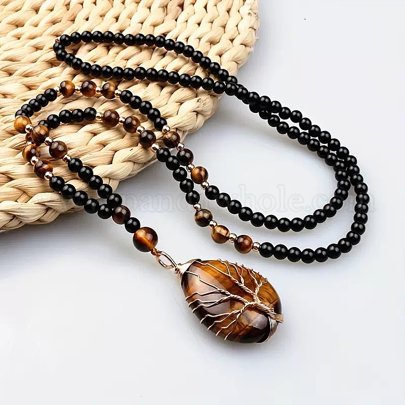 Кулон в виде капли дерева жизни из натурального тигрового глаза, обмотанного медной проволокой, черные круглые бусы, ожерелье для мужчин.
