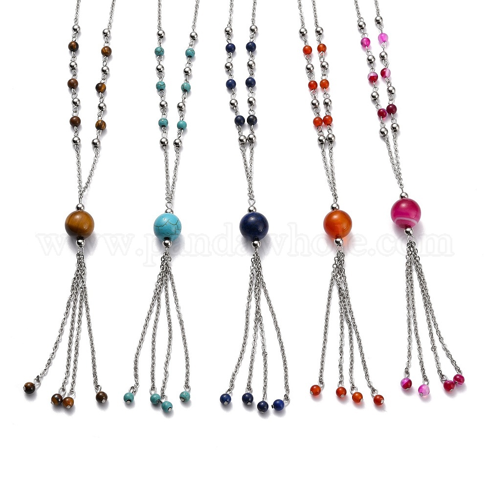 304 подвесные из нержавеющей стали ожерелья, с тросовыми цепями и круглыми бусинами из натуральных и синтетических драгоценных камней