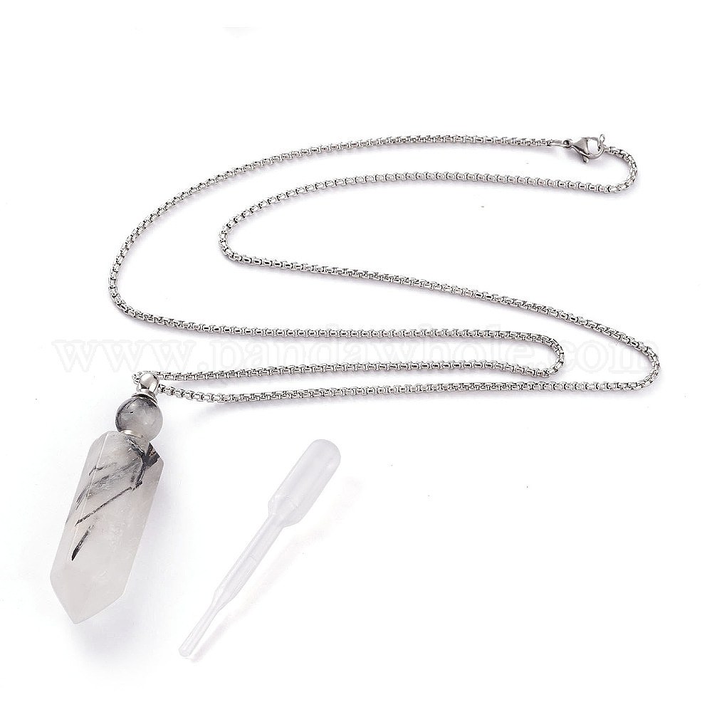 Ожерелья с открываемыми флаконами духов натуральный турмалиновый кварц / черный рутилированный кварц ожерелья с подвесками, с 304 коробчатыми цепями из нержавеющей стали и пластиковой капельницей, граненые, пуля