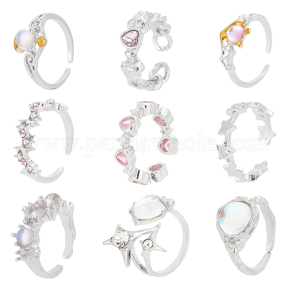 9шт. 9 набор из латуни и сплава с открытыми манжетами в форме сердца, капли и летучей мыши, штабелируемые кольца из стекла, смолы и кубического циркония (02JNSR)