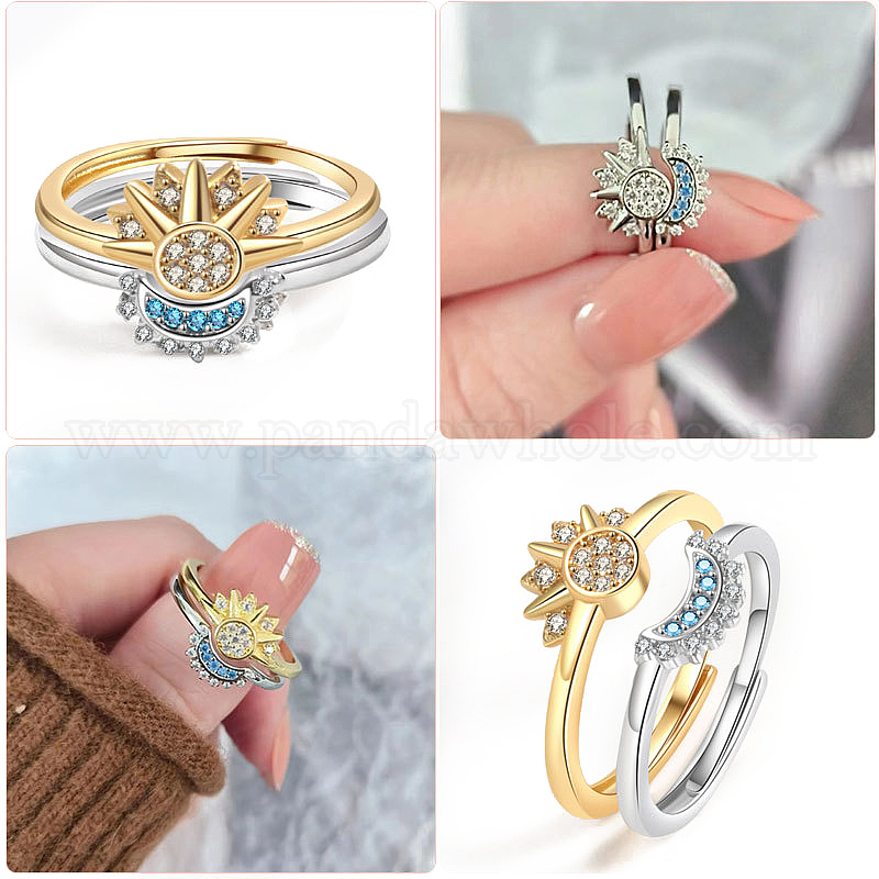• Золотой Пара колец из солнечной латуни с микропаве и фианитом, регулируемое кольцо на палец, золотые, 12 мм, внутренний диаметр: 16 мм