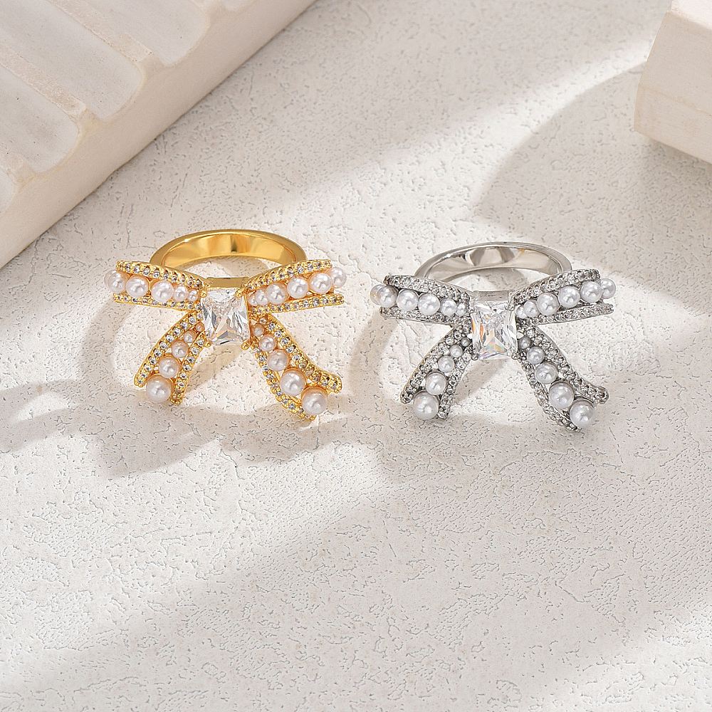 Элегантное латунное кольцо-бантик с прозрачным кубическим цирконием, с пластиковыми искусственными жемчужинами для женщин