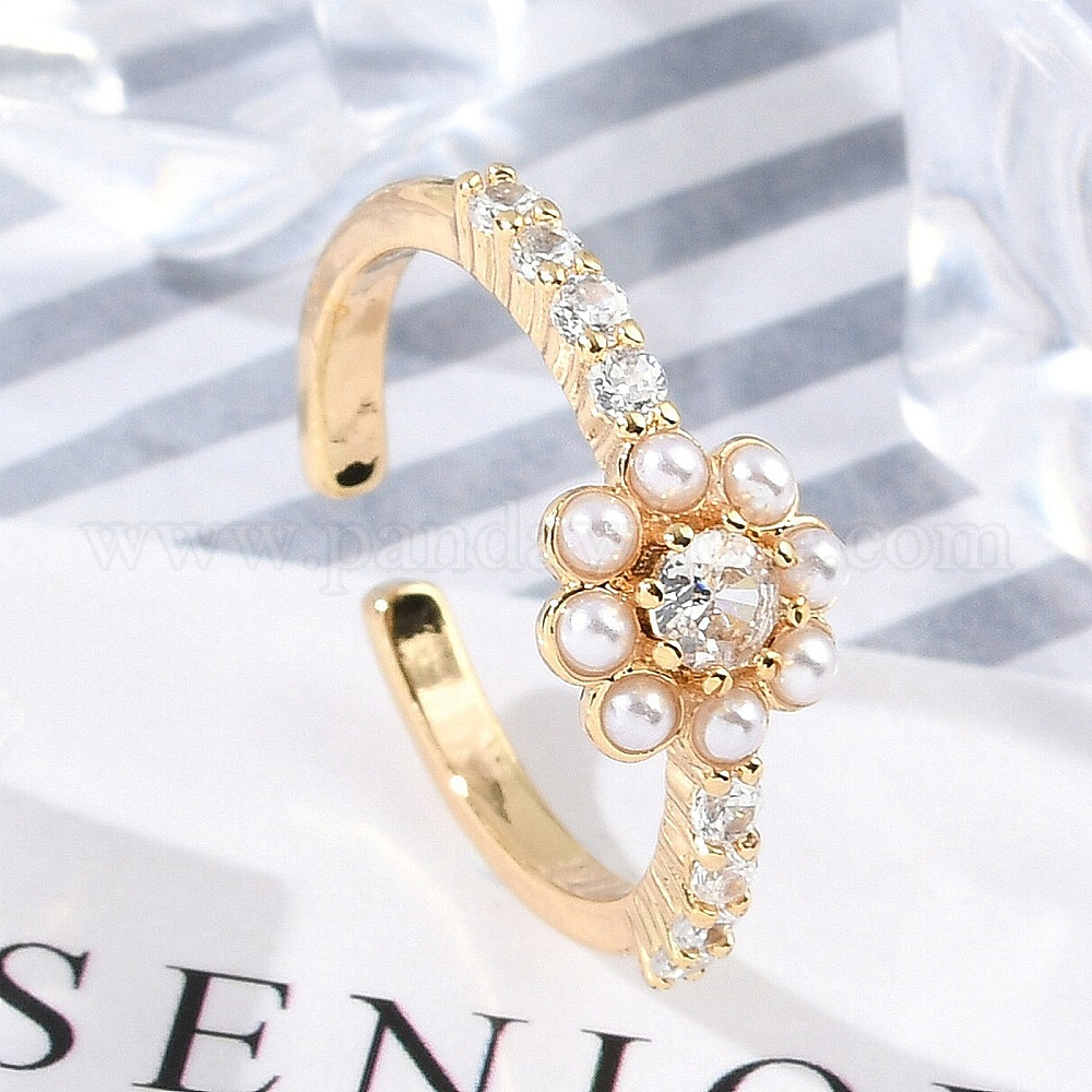 Открытые манжеты из латуни с микропаве и прозрачным цирконием для женщин, цветок, с пластиковой жемчужины