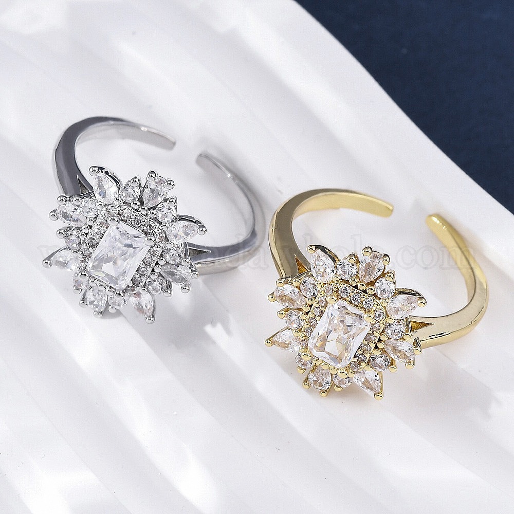 Латунные кольца-манжеты с микропаве и прозрачным цирконием для женщин, Прямоугольник с цветком, без кадмия и без свинца, долговечный, стойки покрытие