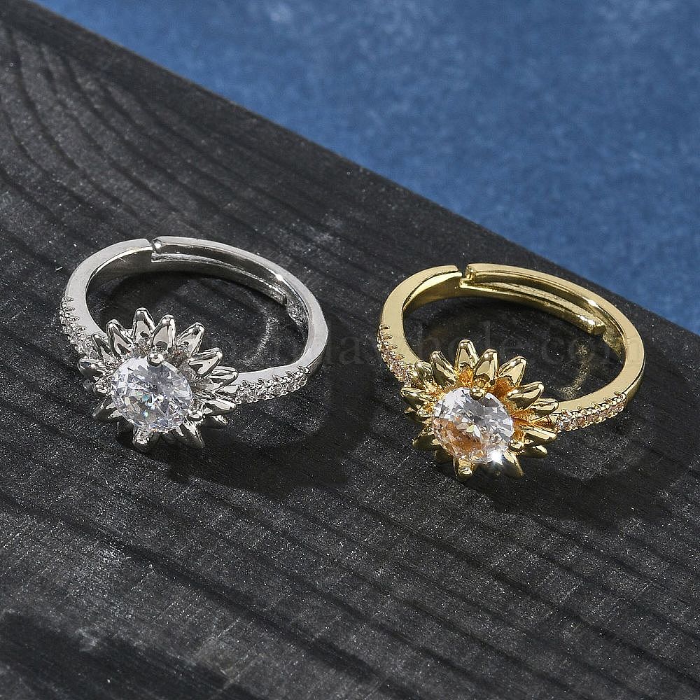 Женские кольца из латуни с цветком и прозрачными кубическими цирконами, долговечный, стойки покрытие, без свинца и без кадмия