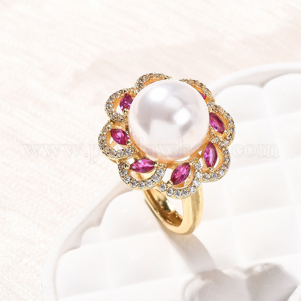 Регулируемые латунные кольца с микропаве из кубического циркония для женщин, цветок, с пластмассовой жемчужиной abs, без кадмия и без свинца, долговечный, стойки покрытие