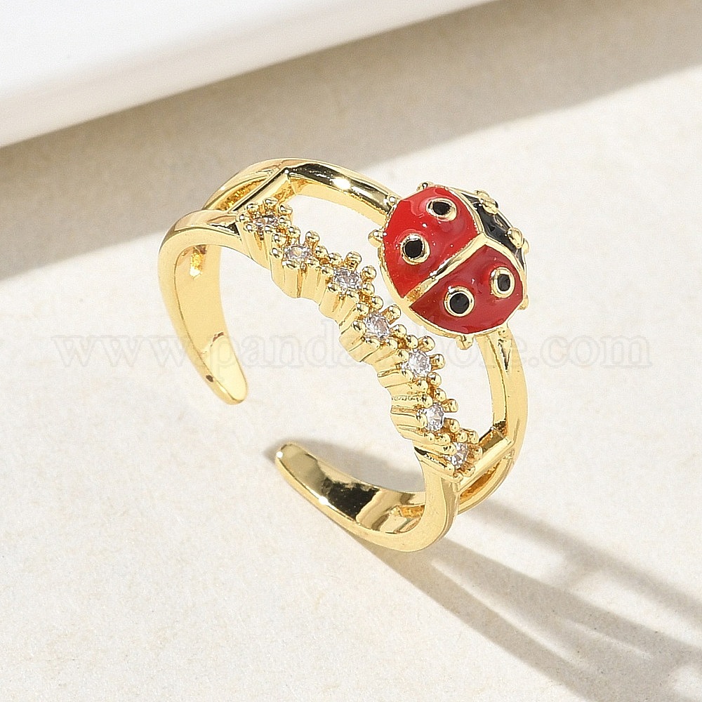 Латунные кольца-манжеты с микропаве из прозрачных кубических цирконий, божья коровка, с эмалью, долговечный, без кадмия и без свинца, стойки покрытие