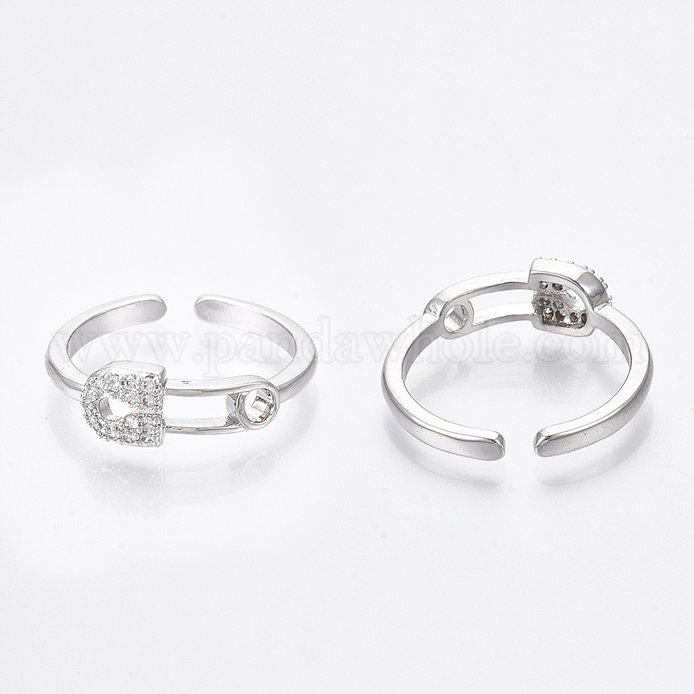 • Платинированный Латунные кольца из манжеты с прозрачным цирконием, открытые кольца, Форма предохранительного штифта, без никеля , Реальная платина, Размер 5, внутренний диаметр: 16 мм