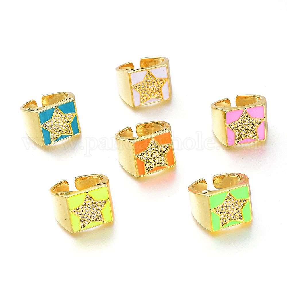 • (52) Непрозрачная лаванда Латунные кольца из манжеты с прозрачным цирконием, открытые кольца, с эмалью, без свинца и без кадмия, квадрат со звездой, реальный 18 k позолоченный, разноцветные, размер США 6 (16.5 мм)