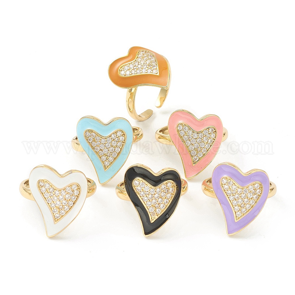 Латунные кольца из манжеты с прозрачным цирконием, открытые кольца, с эмалью, сердце, золотые