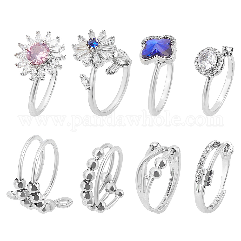 8 шт 8 стиль цветок и бабочка и бриллиантовые стразы вращающиеся открытые манжеты набор со стеклом, Штабелируемые кольца из платины и латуни, успокаивающие беспокойство, для женщин (02JHH4)