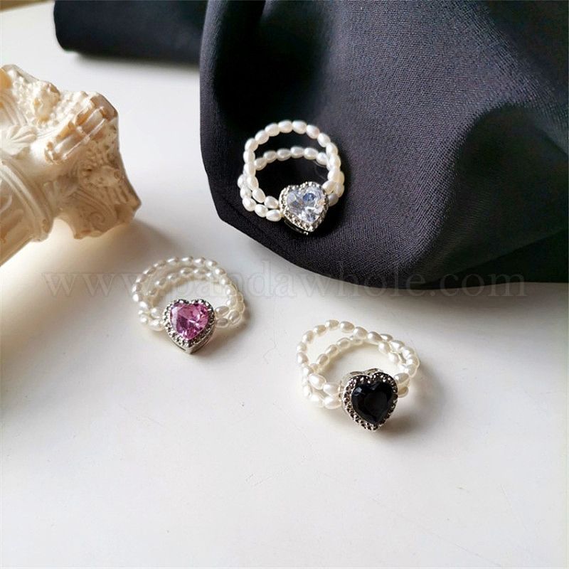 Кольца на палец из сплава со стразами и пластиком с жемчугом, сердце, двухслойные кольца, платина