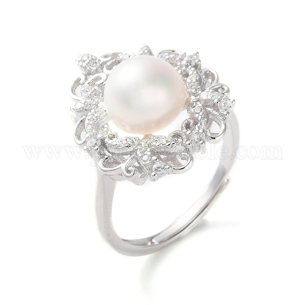 • Платинированный Регулируемые кольца из стерлингового серебра с родиевым покрытием для женщин 925, с микропаве из кубических цирконий и круглой натуральной жемчужиной, Реальная платина, 20.5x17 мм, размер США 7 3/4 (17.9 мм)