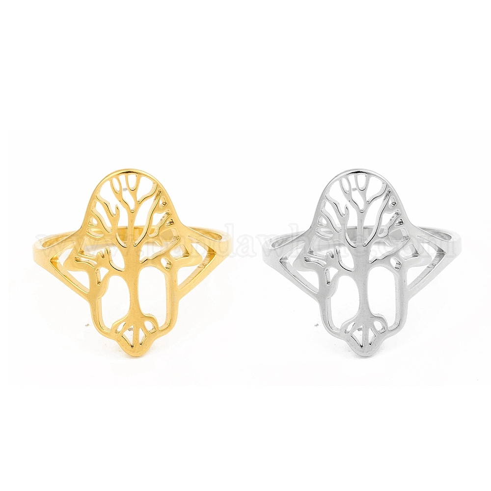 • Золотой 304 кольца из нержавеющей стали, широкое кольцо полоса, полые кольца руки хамса дерево жизни, золотые, внутренний диаметр: 17 мм
