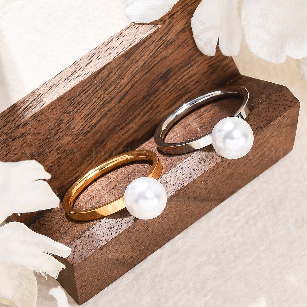 304 кольца для пальцев из нержавеющей стали для женщин, с круглой абс пластмассовой имитационной жемчужиной, вакуумное покрытие pvd (0312RM)