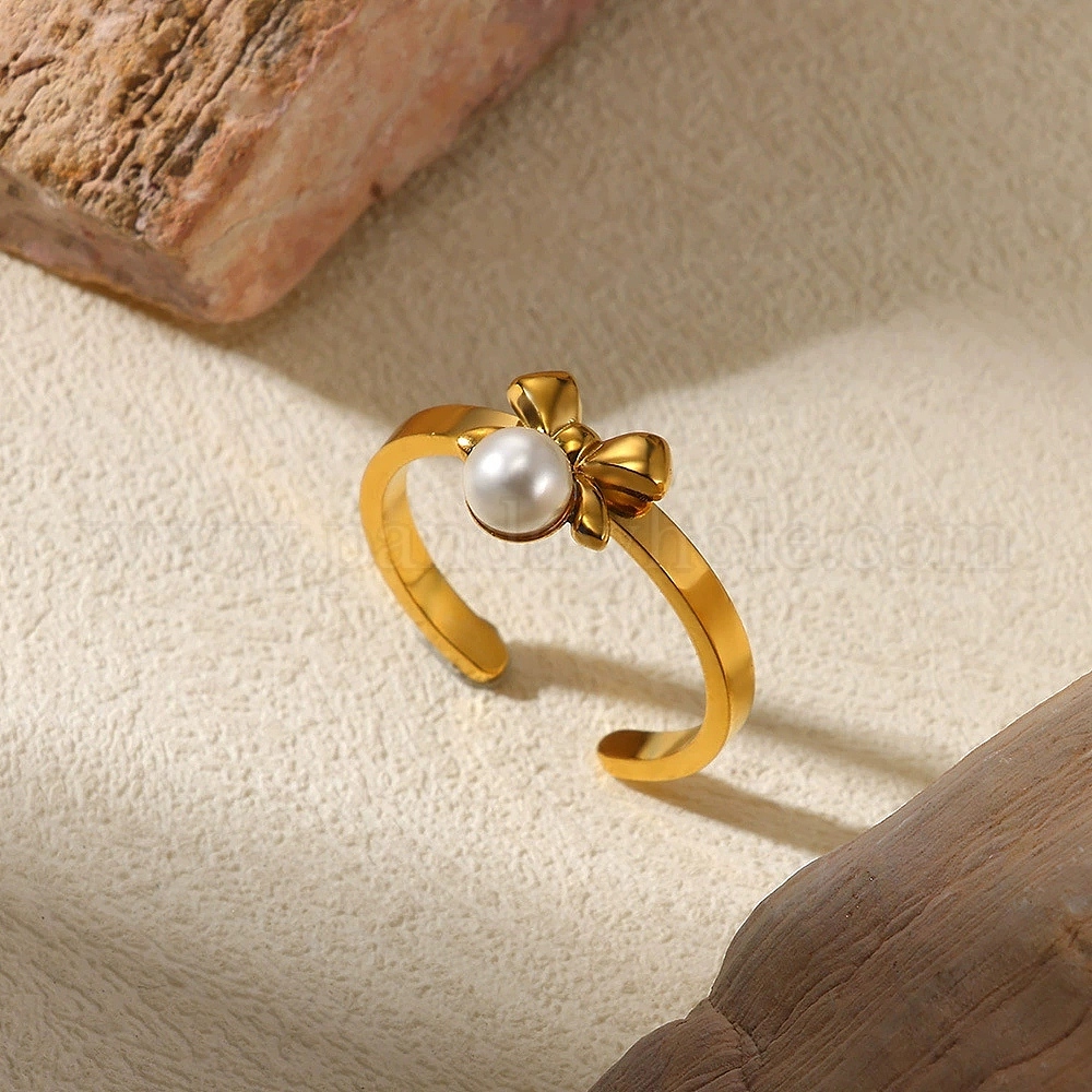 • Настоящее золото 18K 304 Женское кольцо-манжета с открытым жемчугом и пластиковым покрытием из нержавеющей стали, бантом, реальный 18 k позолоченный, 10x9 мм