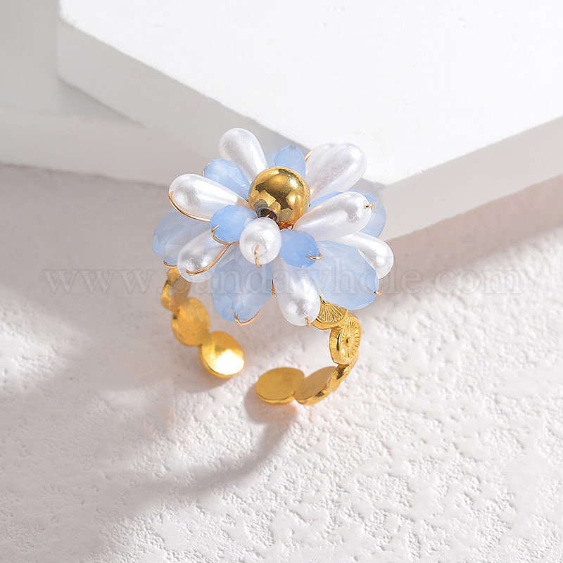 304 Кольца-манжеты из нержавеющей стали с акриловым жемчугом, цветок, стеклянный кристалл и 201 стальной шар в центре, для женщин (033AQJ)