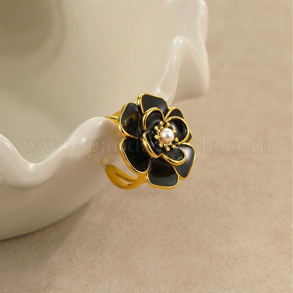304 открытые манжеты с цветком из нержавеющей стали, с эмалью и искусственным жемчугом из АБС для женщин, без кадмия, без никеля и без свинца, ионное покрытие (ip)
