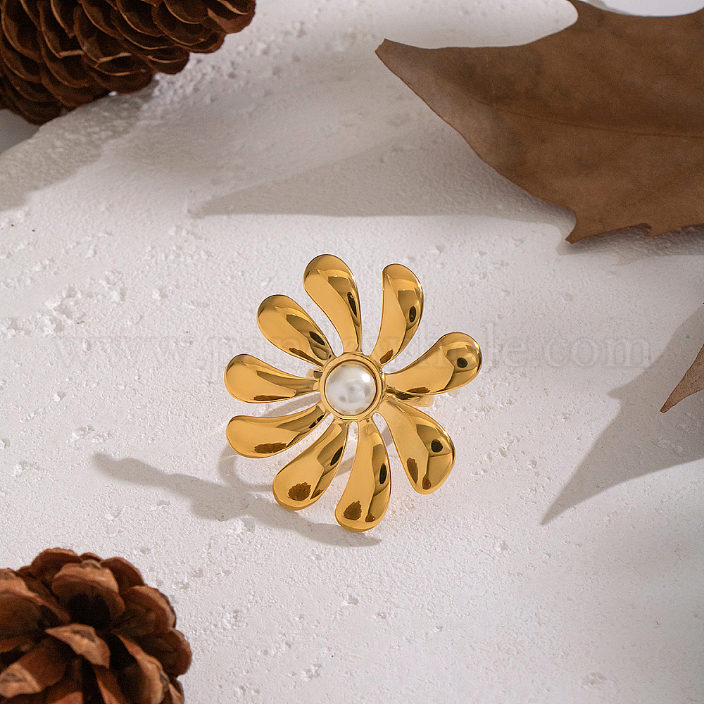304 открытые кольца-манжеты из нержавеющей стали для женщин, цветок, с имитацией жемчуга, вакуумное покрытие pvd