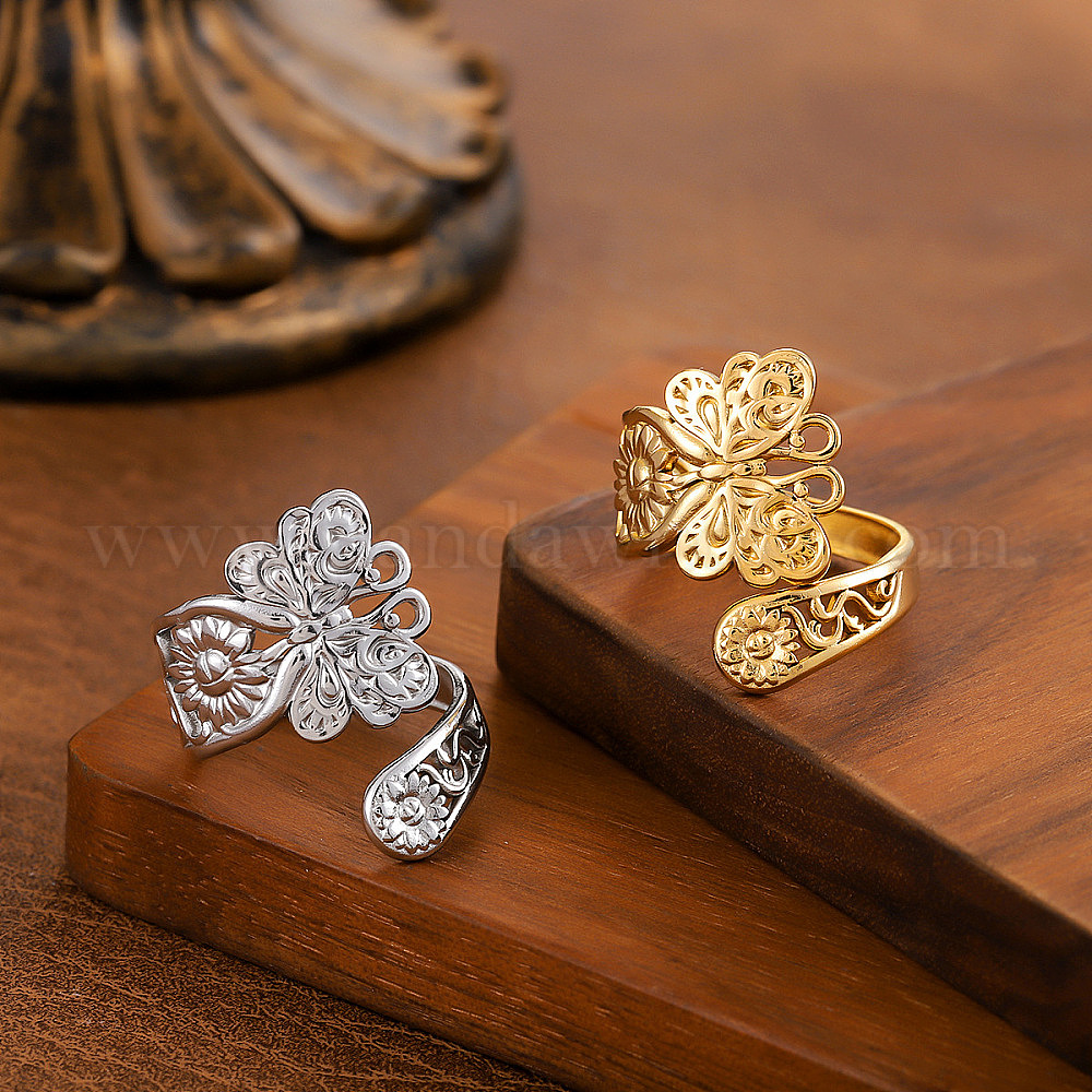 • Золотой 304 открытые кольца-манжеты из нержавеющей стали для женщин, бабочка, золотые, 20 мм