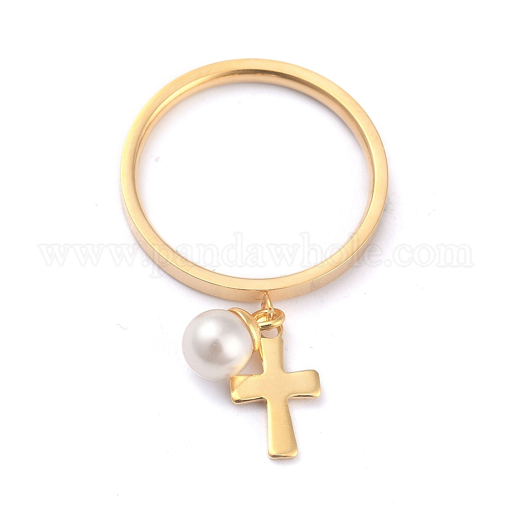 • Золотой Товаров двойного назначения, 304 кольца или подвески из нержавеющей стали, с пластиковыми круглыми бусинами, крестик, белые, золотые, размер США 5~9 (15.7~18.9 мм)