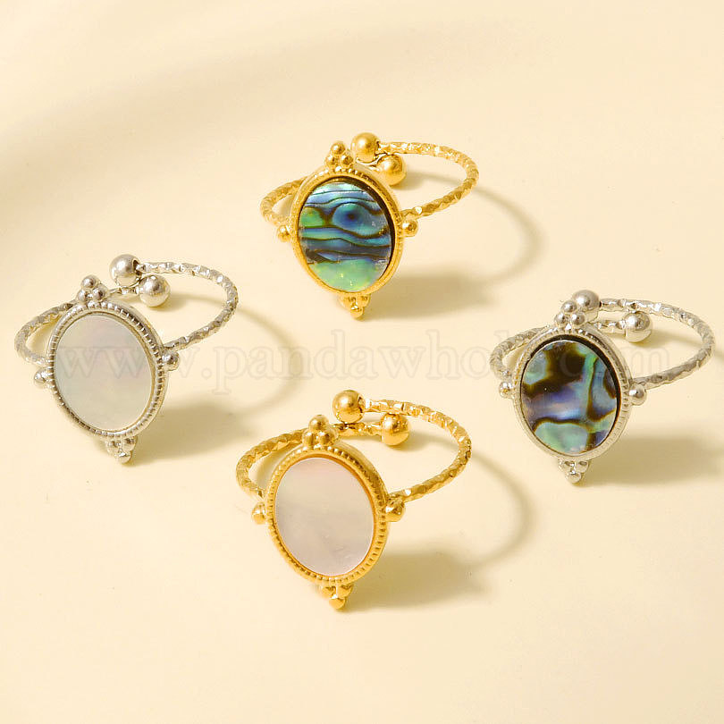 304 Открытые кольца-манжеты из нержавеющей стали с натуральными ракушками для женщин, круглые