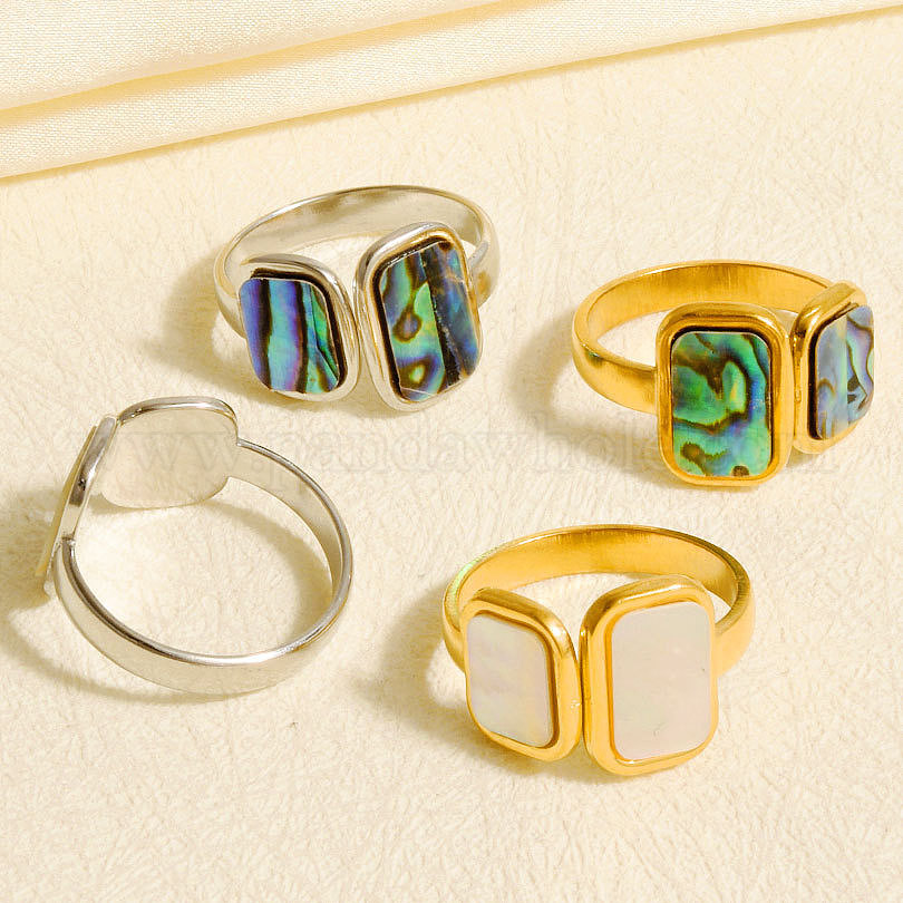 304 Открытые кольца-манжеты из нержавеющей стали с натуральными ракушками для женщин, прямоугольные