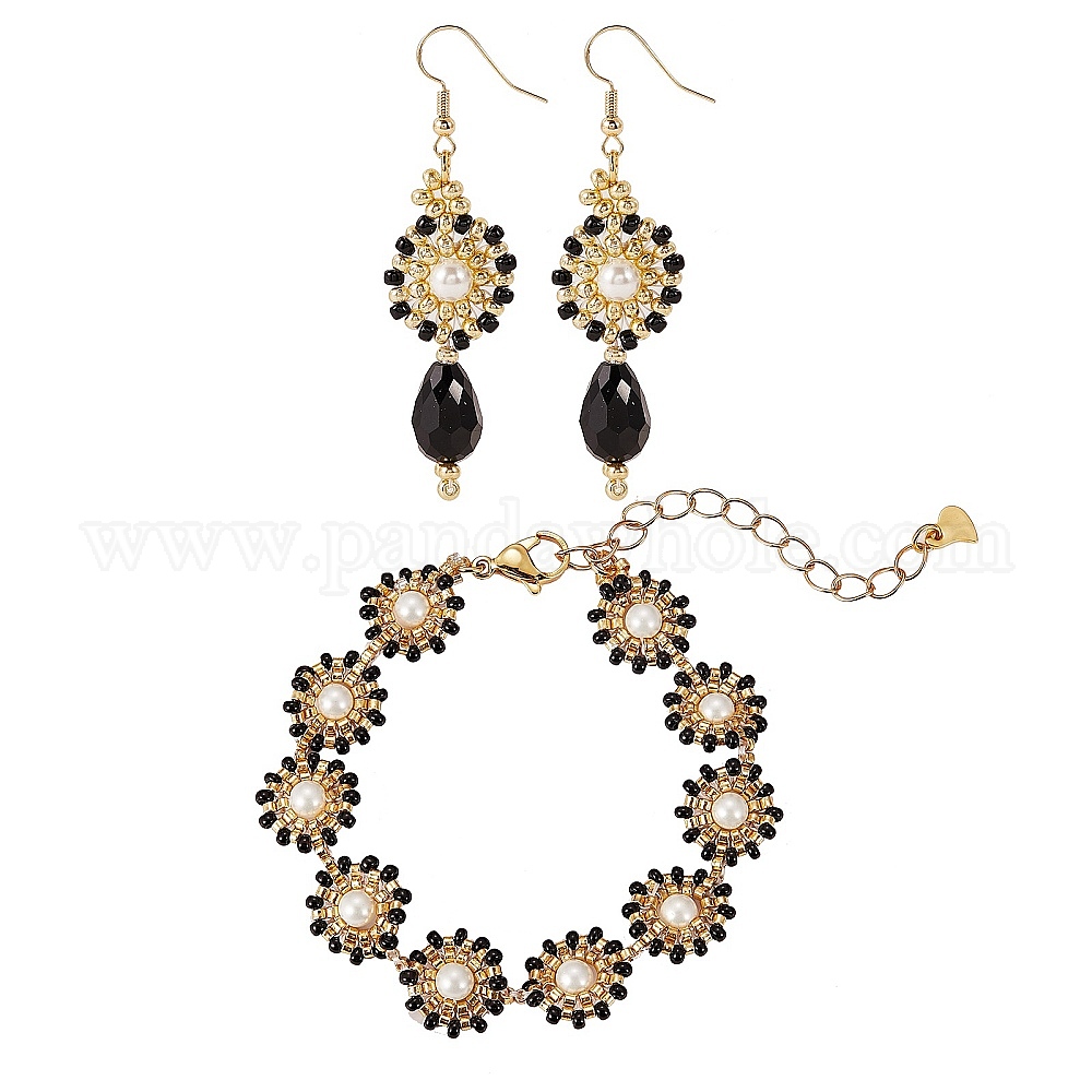 Плетеные плоские круглые серьги с подвесками и браслеты из бисера из жемчуга и стеклянных косточек, набор украшений из латунной проволоки для женщин