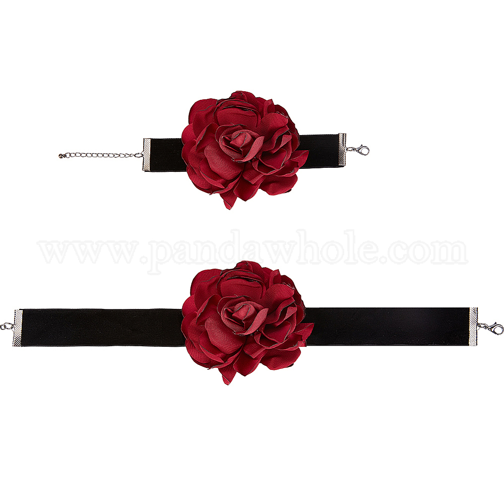 • Темно-Красный Готический тканевый цветочный шнур-браслет и колье-чокер, набор украшений из бархата для женщин, темно-красный, 7~7-3/8 дюйм (17.7~18.7 см), 13.31~13.46 дюйм (33.8~34.2 см), 2 шт / комплект
