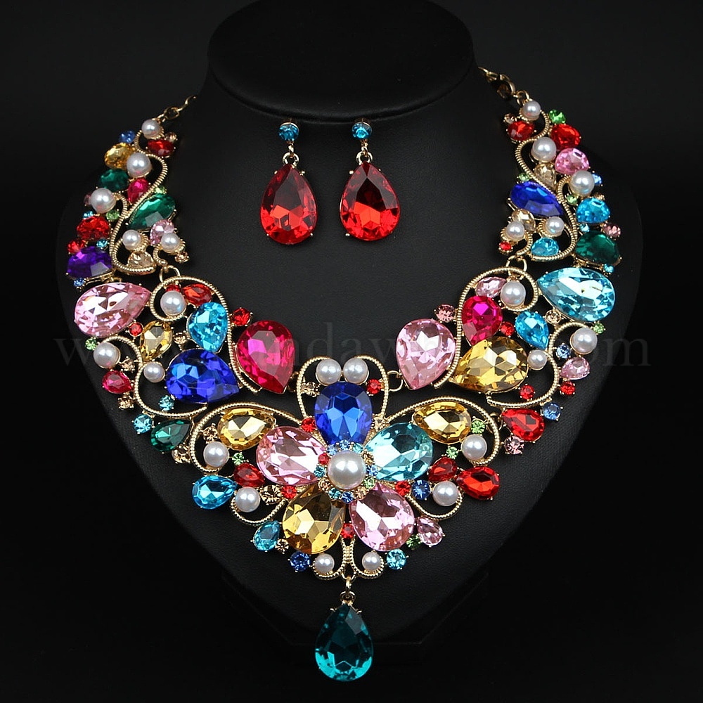 • Разноцветный Комплекты из ожерелий и серег-гвоздиков из сплава со стразами в форме капли для женщин, красочный, 450 мм