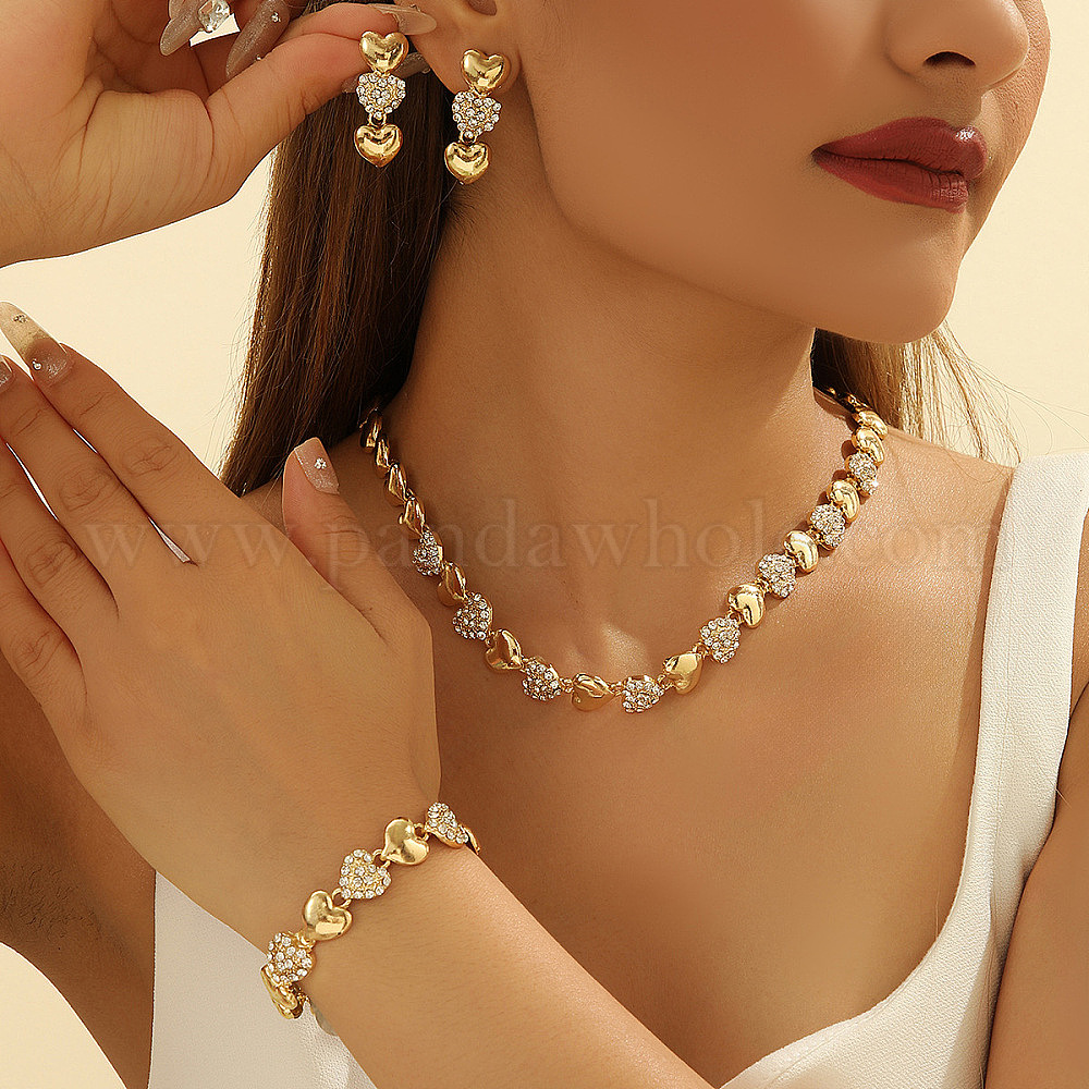 • Золотой Комплекты из ожерелий и браслетов в форме сердца из цинкового сплава со стразами, золотые, 450 мм