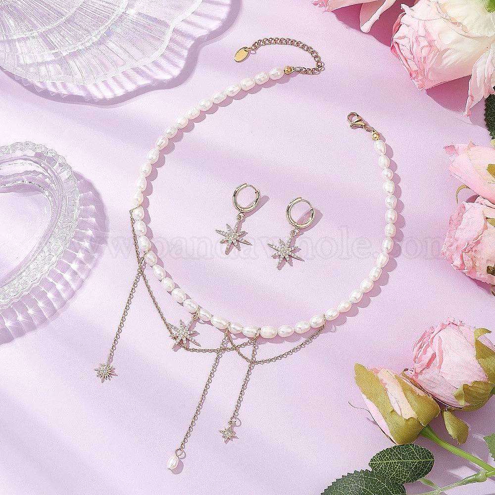 Комплекты из латунных подвесок-звездочек с микропаве из кубических цирконий и серег-колец, с натуральным культивированным пресноводным жемчугом, комплекты украшений для женщин
