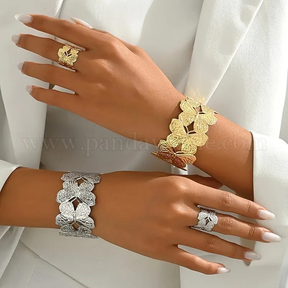 • Платина Наборы из браслетов-манжет и колец из сплава «бабочка» для женщин, платина, внутренний диаметр: 55 мм
