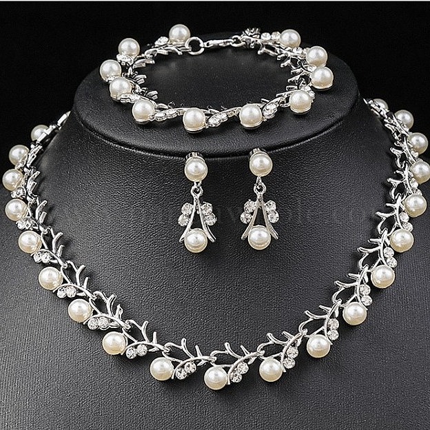 Ожерелья, браслеты и серьги-гвоздики из сплава, хрустальных страз и пластиковых жемчужин в форме листьев