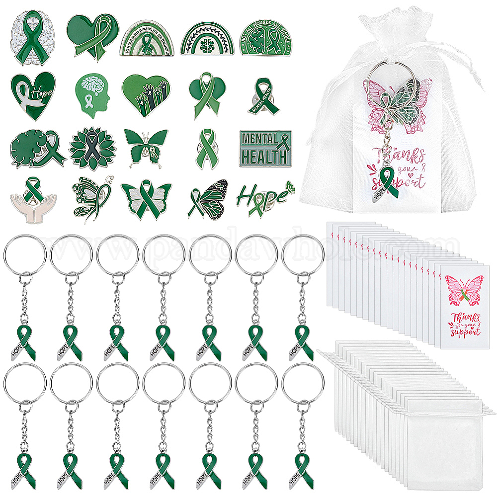 20 Наборы из эмалированного сплава с железным брелком и брошами, подарочными пакетами из органзы и бумажными открытками для повышения осведомленности о психическом здоровье, разнообразные, платина