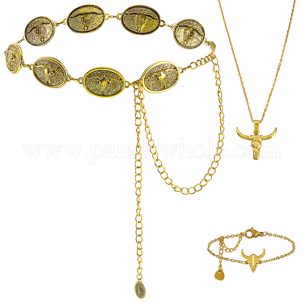 • Золотой Набор украшений в ковбойском стиле, 1 Голова крупного рогатого скота 304 Кулон из нержавеющей стали, с 1шт. 304 браслетами из нержавеющей стали в виде голов крупного рогатого скота и цепочкой в виде головы на талии, золотые, колье: 17.83 дюйм (45.3 см), браслет: около 7-1/8 дюйма (18 см), Поясные цепочки: около 655мм
